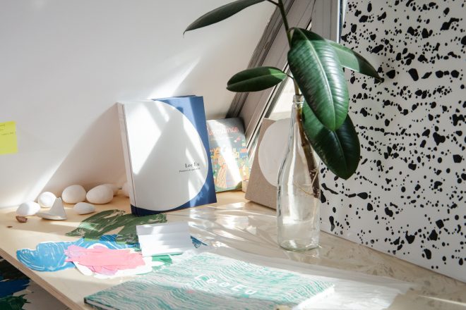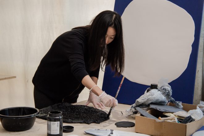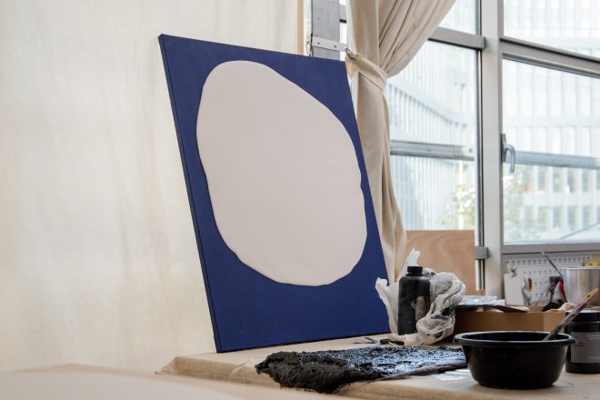 jusqu’à présent qu’une fenêtre, une image nous invitant à plonger dans l’illusion, tel un nouvel outil de modélisation carré. Ainsi, nous ne nous contentons plus de contempler l’univers contenu par la toile, mais nous pouvons désormais observer la toile elle-même, c’est-à-dire l’état de la matière. Par ailleurs, le travail minimaliste de l’artiste, qui consiste à créer une forme parfois en recourant principalement à la force gravitationnelle, parfois par l’ajout de simples touches de pinceau, nous fait réfléchir à ce travail laborieux qu’est la peinture. L’intervention minimale de l’artiste, les pigments débordant de la toile et cette peinture remise en question qui ne représente plus une surface plane, mais plutôt la forme d’un objet… Et à travers ce questionnement, nous partons de nouveau à la recherche des éléments artistiques offerts par cette peinture en question.
